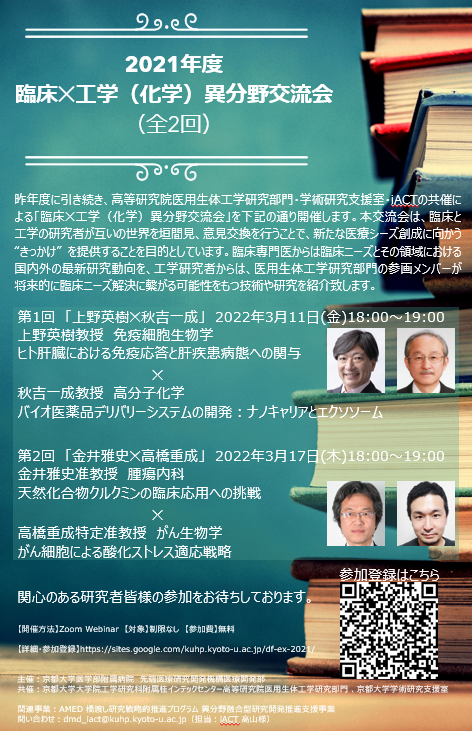 京都大学大学院工学研究科附属桂インテックセンター高等研究院医用生体工学研究部門では、京都大学医学研究科「医学領域」産学連携推進機構(KUMBL)、京都大学学術研究支援室との共催による「『臨床x工学』オンライン異分野交流会」を下記の通り2回開催いたします。昨年度に引き続き、高等研究院医用生体工学研究部門、学術研究支援室、iACTの共催による「臨床✕工学(化学)異分野交流会」を下記の通り開催いたします。本交流会は、臨床と工学の研究者が互いの世界を垣間見、意見交換を行うことで、新たな医療シーズ創成に向かう“きっかけ” を提供することを目的としています。臨床専門医からは臨床ニーズとその領域における国内外の最新研究動向を、工学研究者からは、医用生体工学研究部門の参画メンバーが将来的に臨床ニーズ解決に繋がる可能性をもつ技術や研究を紹介いたします。